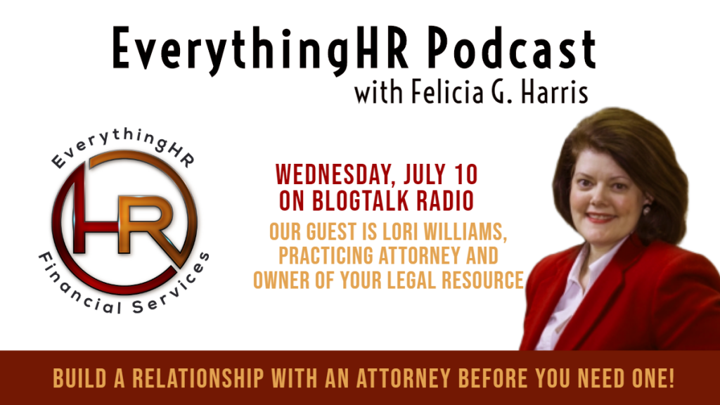 Felicia Harris, Founder, and CEO of EverythingHR and EverythingHR Financial Services interview Lori Williams, a 30-year attorney licensed in the state of Michigan. Lori talks about how she went from divorce law to Your Legal Resource, a legal referral service. She also explains what Your Legal Resource can offer business clients, how to go about building relationships with attorneys, and the types of legal needs that her clients typically have.